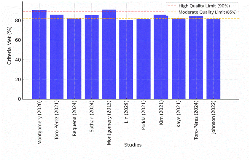 The analysis of the evidence was carried out through the organization and structured presentation of the extracted data. To this end, tables, graphs, and visual representations were used in order to optimize the intelligibility of the findings presented descriptively. The selected studies were also analyzed for quality using the JBI Checklist for Analytical Cross Sectional Studies(8). Aspects such as the definition of subjects and settings, the validity and reliability of exposure measurement, the adequacy of diagnostic criteria, the identification and control of confounding factors, the validity and reliability of outcome measurements, and the appropriate use of statistical analysis were evaluated. Studies that met more than 90% of these criteria were classified as high quality(9). For the assessment of risk of bias and methodological quality of the studies, the Robvis Online tool was used, adapted according to JBI recommendations(8,10).