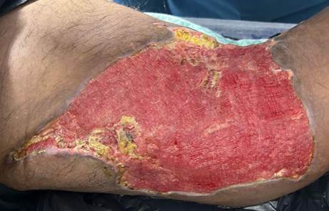 A lesão apresentava extensão aproximada de 30 cm x 20 cm em suas maiores dimensões e 2,5 cm de profundidade, tecido do leito da ferida 90% de granulação insalubre e 10% de esfacelo aderido, sem sinais de infecção sistêmica, grande quantidade de exsudato serosanguinolento, sem odor fétido, bordas aderidas e regulares. (Figura 2).