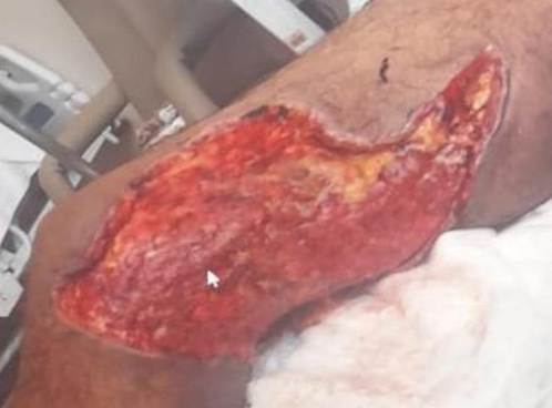 On D3, the individual was already pain-free, with regression of edema and a reduction in inflammatory signs of the limb. However, the skin lesion progressed with wound dehiscence and extensive necrosis, and on D9 there was a need for referral to a hospital service for surgical debridement.