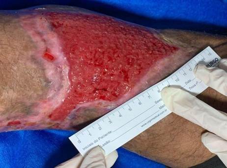 On D29, the patient returned to the UBS for follow-up and treatment. Topical treatment was carried out based on cleansing of the wound bed using an antiseptic containing polyhexamethylene biguanide, cleansing and moisturizing of the periwound skin, and application of absorbent, non-adherent primary dressings (foams and hydrofibers) containing silver.