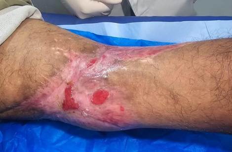 A 38-year-old male individual, single, illiterate, employed as an automotive washing assistant, living alone at his workplace under poor hygienic conditions. He was a victim of a collision with a heavy vehicle traveling at low speed on March 4, 2025, in the central region of the Federal District, Brazil. He sustained an extensive laceration-contusion injury to the medial aspect of the right thigh. He was referred by the mobile pre-hospital emergency service to a referral hospital, where a primary suture measuring approximately 33 cm in length, in a “U” shape, was performed. Two days after the trauma, the individual sought care at a UBS, accompanied by acquaintances, reporting severe pain, edema, and induration of the affected limb, with difficulty ambulating and exposure of the surgical wound. He was unable to provide information regarding his vaccination history. He denied regular medication use and allergies. Personal history included history of alcohol use.