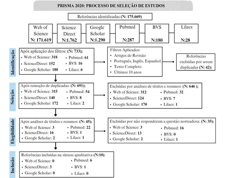 A declaração PRISMA 2020 ressalta que revisões sistemáticas devem descrever de maneira transparente e detalhada o processo de identificação e seleção dos estudos. Destaca ainda que, as diretrizes também orientam a utilização de um fluxograma que apresente as etapas de identificação, triagem, elegibilidade e inclusão final dos trabalhos. Considerando essas orientações, elaborou-se o fluxograma a seguir, que reúne todas as etapas do processo de seleção dos estudos desta revisão(11).