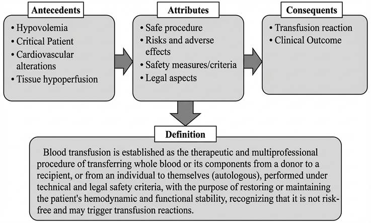 From this perspective, the complexity of the procedure highlights the need for a conceptual definition of the term "blood transfusion", considering that the literature presents the concept in a heterogeneous and imprecise manner. According to Walker and Avant(16), the analysis of the concept is a methodological process aimed at clarifying the meaning of a term, identifying essential attributes, antecedents, consequences, and empirical references, ensuring its proper use in care, teaching, and research.